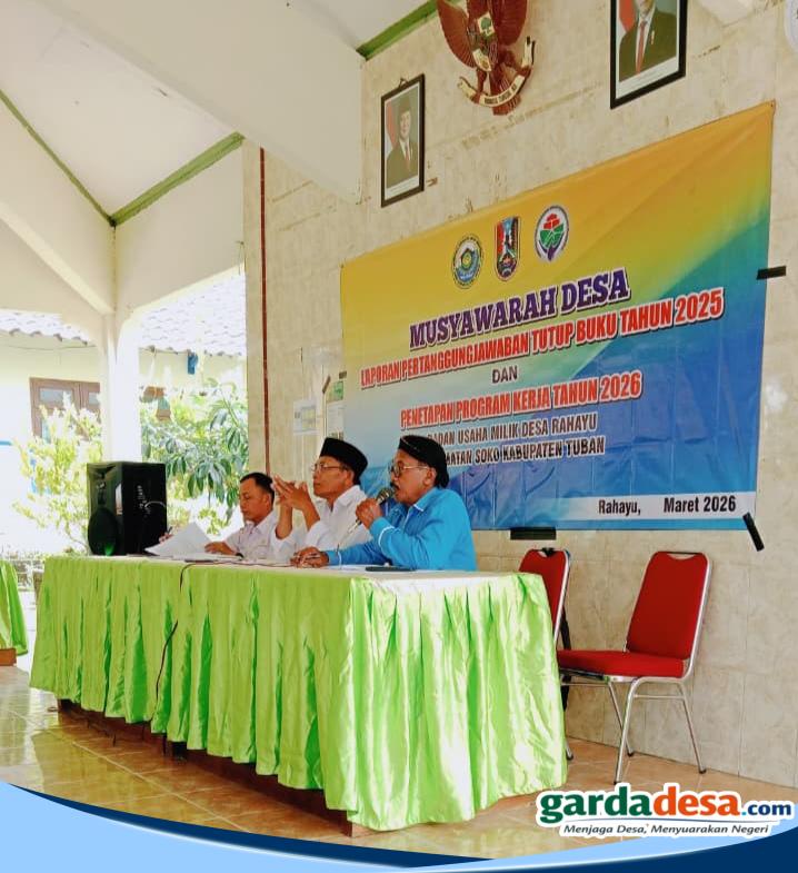 gardadesa.com, Tuban – Badan Usaha Milik Desa (BUMDes) Desa Rahayu, Kecamatan Soko, Kabupaten Tuban, menggelar agenda Laporan Pertanggungjawaban Tutup Buku Tahun 2025 yang dirangkai dengan penetapan program kerja Tahun 2026. Kegiatan berlangsung dalam suasana penuh kebersamaan dan optimisme, dihadiri pemerintah desa, pengurus BUMDes, BPD, serta unsur lembaga desa.Rabu, 4/3/2026