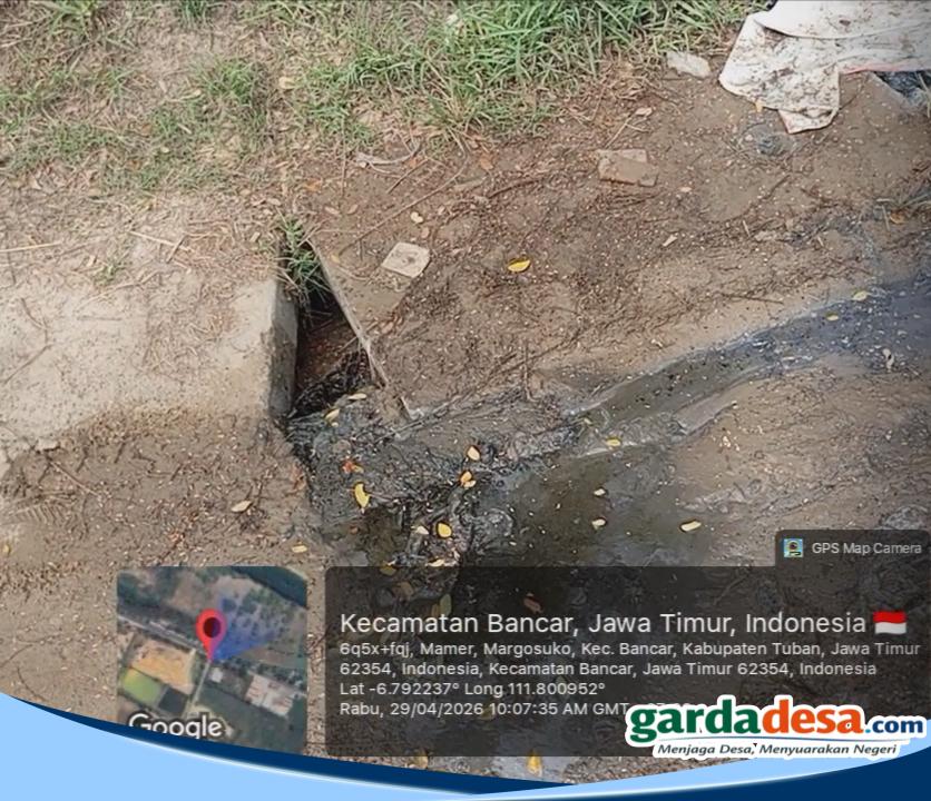 gardadesa.com, Tuban – Persoalan dugaan pencemaran lingkungan kembali mencuat di Desa Margosuko, Kecamatan Bancar, Kabupaten Tuban. Warga mengeluhkan limbah berwarna gelap dan berbau menyengat yang diduga berasal dari aktivitas SPPG Yayasan Darma Wangsa Sakti, meluber hingga ke badan jalan, Rabu (29/4/2026).