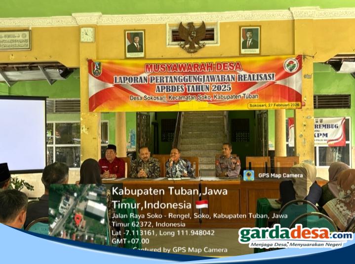 gardadesa.com, Tuban – Pemerintah Desa Sokosari, Kecamatan Soko, Kabupaten Tuban, menggelar penyampaian Laporan Pertanggungjawaban (LPJ) Realisasi APBDes Tahun Anggaran 2025 sebagai bentuk komitmen terhadap transparansi dan akuntabilitas pengelolaan keuangan desa. Jum’at 27/2/2026